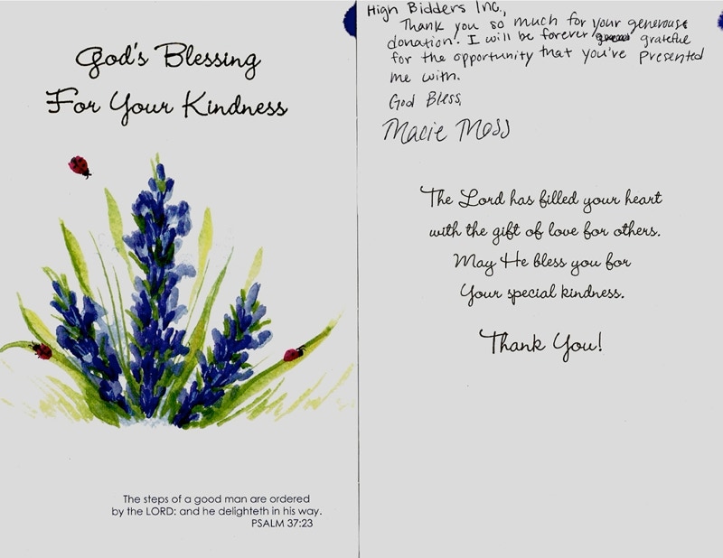 1984 High Bidders, Inc., dba High Bidders is a 501(c)(3) public charity in which all contributions / donations are tax deductible as allowed by law